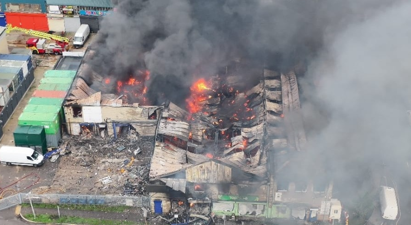 “This decision has been taken due to the suspected presence of fireworks and cylinders being stored within the structure. All firefighters have withdrawn to a safe distance and are now fighting the fire from a greater distance to ensure crew safety.