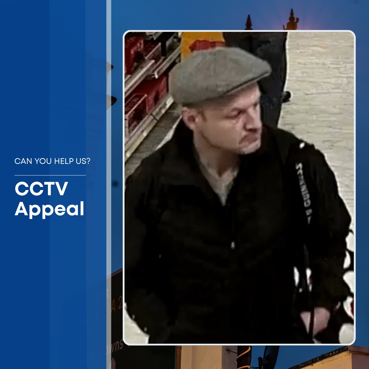 The suspect is described as white, slim, with short dark hair, and was wearing a grey flat cap and carrying a black and white bag.