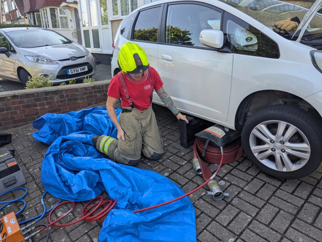 Animal Rescue Officer Sam Matthews responded to the call. He said: “The London Fire Brigade were called out to help as this poor cat was stuck and in a lot of distress, and was difficult to reach. After the fire officers moved parts of the vehicle, I was able to reach him with a grasper pole and bring him to safety.
